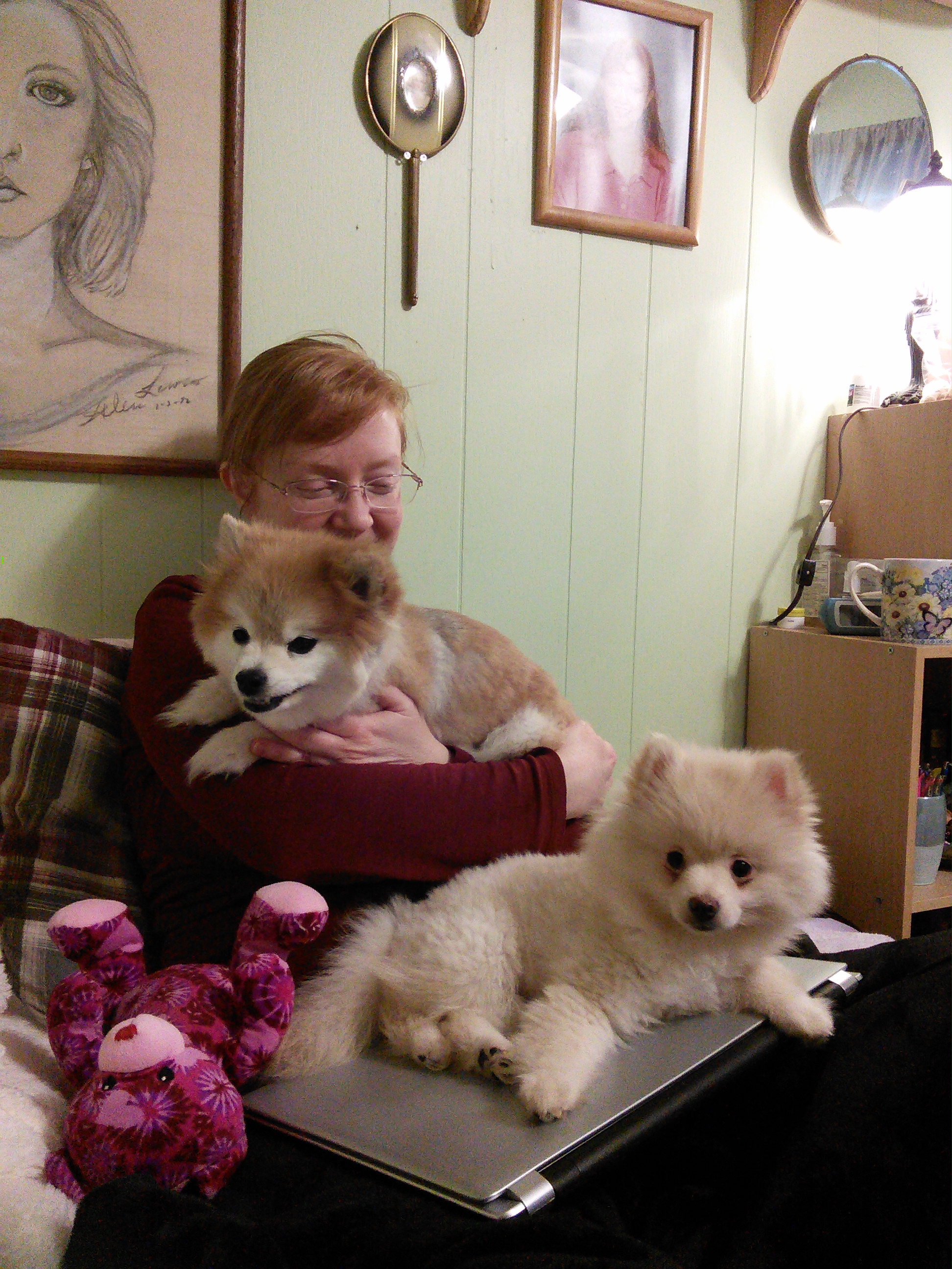 Peanut and I have been together since she was 6 weeks old. It was love at first sight for both of us. We went through college together. We have worked my day job together. We have struggled through health issues together. Through it all, we have written our stories. She has been there for every single word of every novel. Now Sassy has joined in the vigil. Sometimes it is a challenge accommodating two pommies while I type out my first drafts or edit first thing in the morning, especially if they think cuddles or play time should come first.